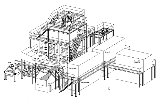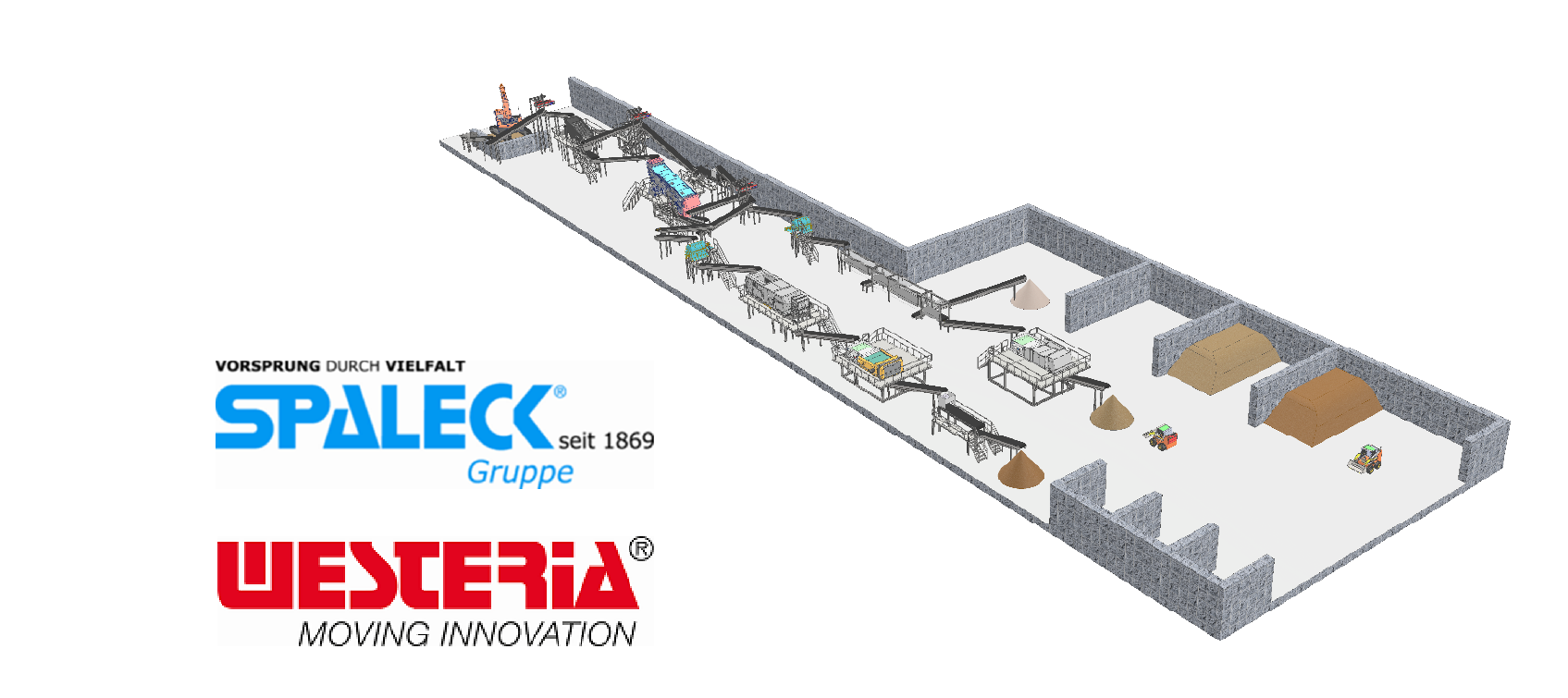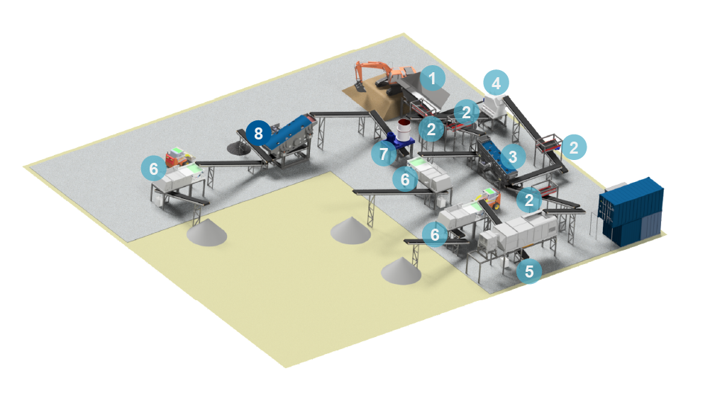 The soil municipal waste mix, mostly wet excavated, pre screened via drum screen with a 100 mm cutting size to separate bulky material in front. In a second fractionating step a 3D double deck screen separate oversized material over 50 mm from a middle fraction, 50 mm to 10mm and a fine fraction of under 10mm. The oversized and the middle-sized fraction are sent over via over belt magnet step and wind shifting step to a sorting stand.
