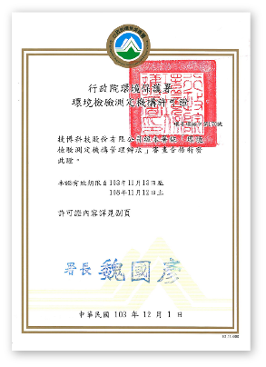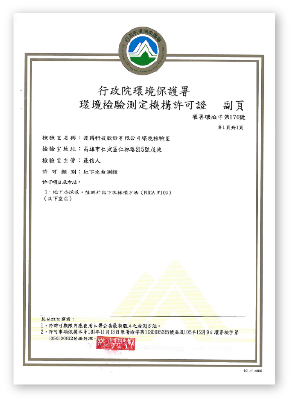 環境檢驗室(環署環檢字第170號):土壤中重金屬及有機污染物採樣、監測井地下水採樣。
