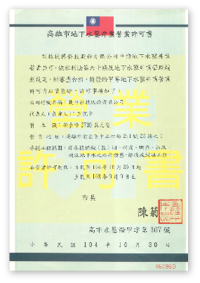 甲級鑿井業(高市水鑿證甲字第367號):中空螺旋鑽設井工程、氣旋鑽設井工程。