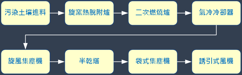 - 熱脫附處理技術為土壤整治技術之一種,係利用加熱之方式將受有機污染土壤加熱至有機物沸點以上,使吸附於土壤中之有機物揮發成氣態後再分離處理,此方式為物理分離程序。此處理方法已經驗證可應用於處理污染土壤、底泥、污泥及濾餅等。