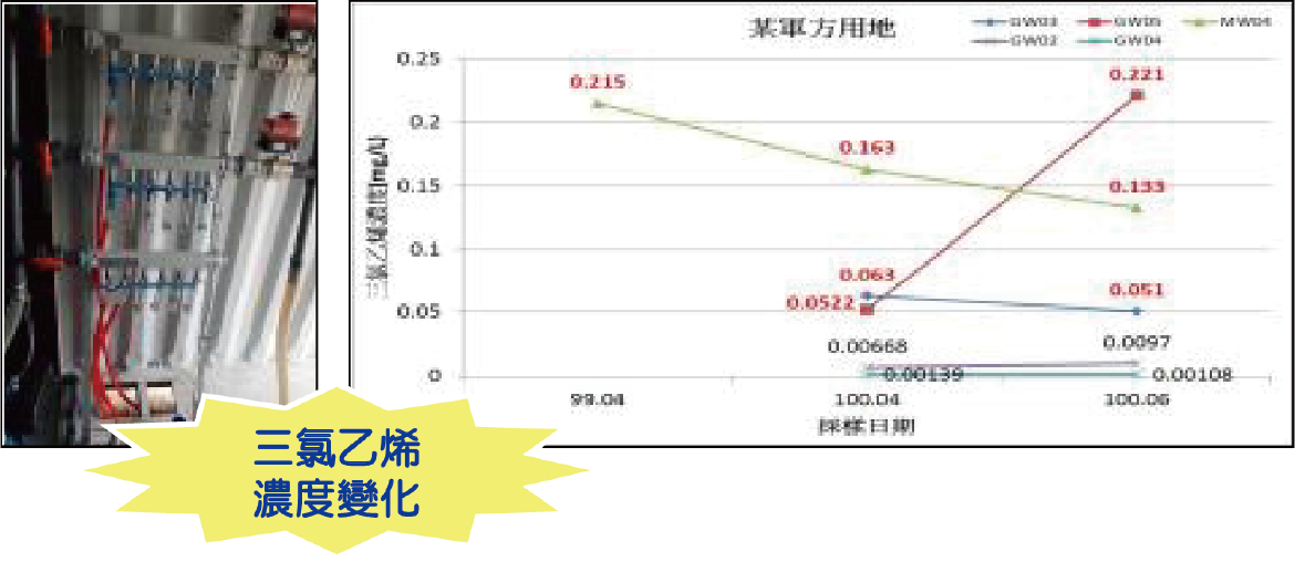 保養場之地下水監測井,三氯乙烯超過地下水污染管制標準。初步研判可能於裝備保養時有使用含氯之溶劑,導致地下水中三氯乙烯污染。