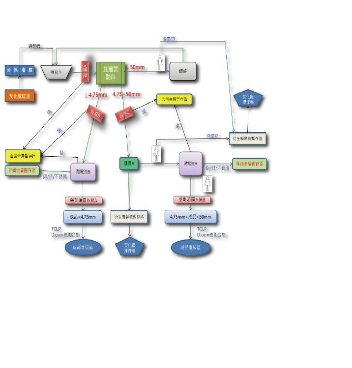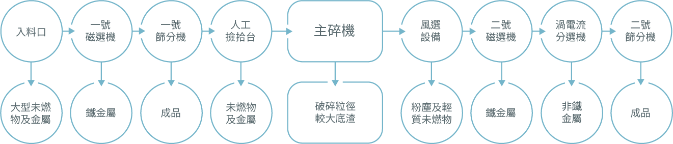 我國底渣細粒徑佔比高,以往傳統篩分之方式已不適用,故採專業精細分選處理,本公司設計之焚化底渣處理廠係引進德國設備技術,建置國內首座具備彈跳篩及多道渦電流、磁選、風選與空氣刀分選等系統,透過升級分選技術,可增加鐵金屬、非鐵金屬回收效率,並分離出4.75~19mm (粗粒料)、2~4.75 mm(細粒料)及小於2 mm以下(極細粒料)之3種再生粒料,其效能為全國最優之底渣處理廠,且為國內底渣再利用領域建立新標竿。