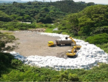 開挖作業以挖土機配合傾卸式卡車進行,作業過程中因掩埋場常有積水問題,故配合現場掩埋情形調整使用抓鬥、挖鬥及隔柵式挖鬥進行開挖,依掩埋物及覆土分層逐步開挖,開挖過程並配合進行抽水作業,抽除之滲出水導送至滲出水處理廠處理。