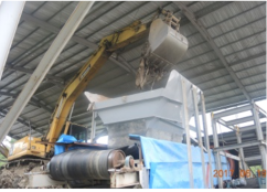 進料系統由進料斗、減速馬達及輸送帶組成,將篩分物輸送至滾筒篩,藉由可調整之進料口大小、輸送帶運轉速度,來配合挖土機投料時不同性質掩埋物及及投料量。輸送系統主要由輸送帶組成,並依分選前後物料性質及單位輸送量,選擇使用不同型式及寬度之輸送帶,來達到整體系統進、出料之平衡,減少阻塞卡料之問題。