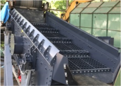 本工程使用之振動篩為雙層設計,主要篩分體積較小(<10cm)之廢棄物與砂土混合物,其篩網與一般工程使用之平面篩網不同,為孔徑7cm之立體隔柵篩及孔徑0.8cm之彈跳式篩網,上層格柵篩於篩分過程中,廢棄物於篩網上進行翻滾,增加停留時間並可充分將廢棄物中夾雜之砂土震出,且可避免廢棄物卡住篩網之情形;下層之彈跳篩則進行直徑小於7cm之廢棄物篩分,藉由篩分過程中之彈跳,將廢棄物表面因含水率較高而附著之砂土震出,降低垃圾中所含之砂土量。